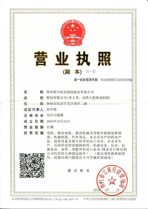 ? ? ? ?鐘祥新宇機電制造股份有限公司前身是鐘祥電機廠,1968年 籌建工廠,原機電部確認為定點生產中小型電機的專業廠家。于2014年09月24日由“鐘祥新宇機電制造有限公司”變更名為“鐘祥新宇機電制造股份有限公司”。主要生產各類振動電機、振動機械、輸送機械。是中國電器工業協會中小型電機分會理事單位、中國重型機械工業協會洗選設備專業委員會理事單位,是中國大型的振動電機生產廠家。